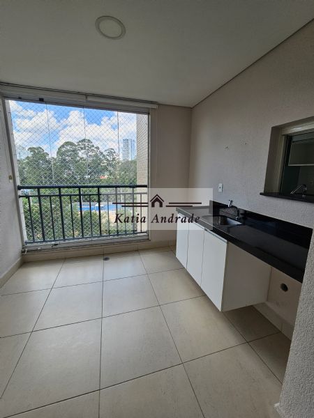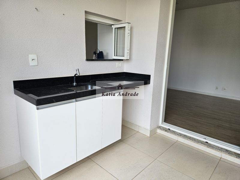 Varanda gourmet com pia, gabinete, fechamento em vidro, cortina painel e tela de proteção;