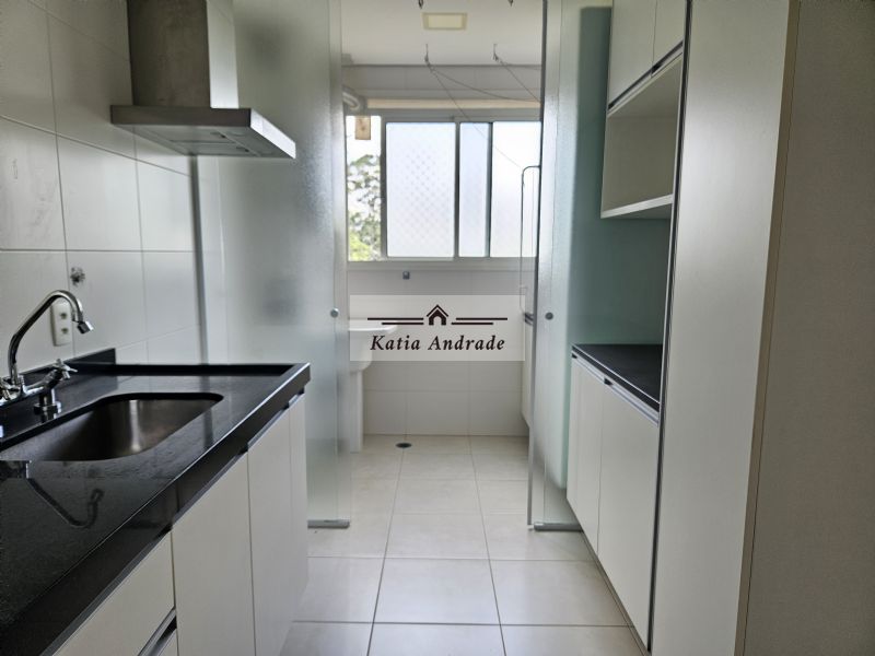 Cozinha planejada com armários e coifa e divisória para lavanderia;